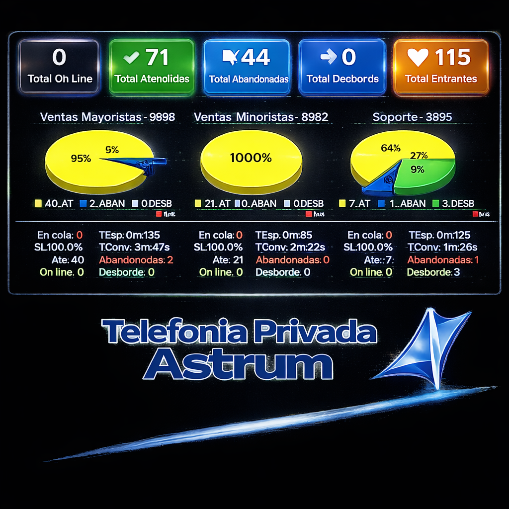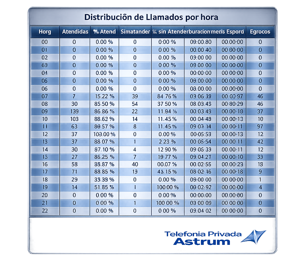 • Reportes completos: atendidas, no atendidas, ingresos por día/hora y salientes